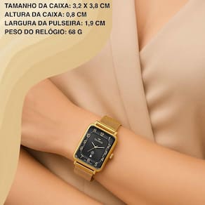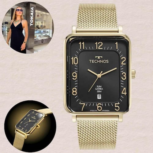 Marca: Technos Modelo: GM10YR/1P Linha/Coleção: Classic Mecanismo: Quartzo Material da Caixa: Aço Inoxidável Material da Pulseira: Aço Inoxidável Material do Vidro: Cristal Mineral Tipo de Mostrador: Analógico Cor da Caixa: Dourado Cor do Mostrador: Grafite com detalhes dourados Cor da Pulseira: Dourado Tipo de Fecho: Gancho com trava Resistência à Água: 3 ATM (30 metros) Formato da Caixa: Quadrado Gênero: Unissex Estilo: Social / Casual Funções: Calendário