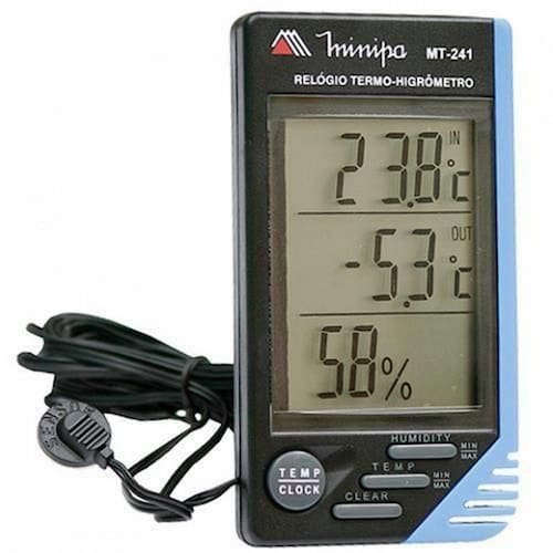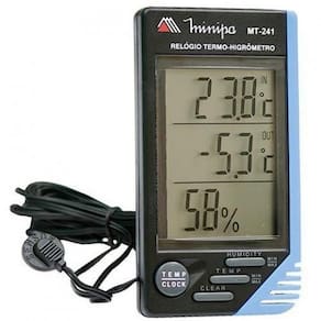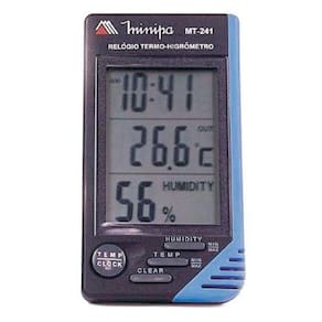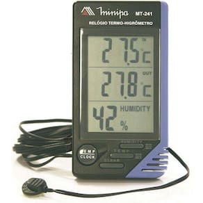 - Instrumento digital portátil, com medida de temperatura apenas interna, 3 leituras simultâneas, indicação de horas, registro de máximo e mínimo e precisão básica de 1°C e 5% RH. - Realiza medidas de temperatura interna (ambiente em que se encontra o instrumento) de 0°C a 50°C (32°F a 122°F) e umidade relativa interna de 20% a 90%.