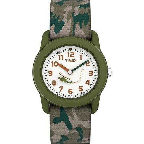 Relógio Timex Boys T78141 Time Machines Green Camo com pulseira de tecido elástico — Camuflagem verde ajustável de 16 mm — Mostrador branco de fácil leitura com minutos marcados para aprender; gráfico giratório divertido em segunda mão — Estojo de resina verde translúcido de 28 mm com lente acrílica — Resistente à água até 30 m (100 pés): em geral, resiste a respingos ou breve imersão na água, mas não é adequado para nadar ou tomar banho - As imagens podem variar da imagem exibida, pois o helicóptero se move a cada segundo. NOTA: Remova a etiqueta antes de usar.
