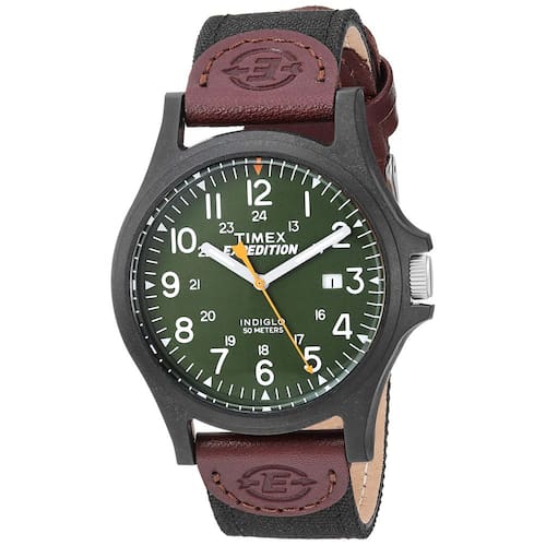 Relógio masculino Timex TWF3C8430 Expedition Acadia preto/marrom/verde escuro com pulseira de couro/nylon — Pulseira ajustável de couro e tecido genuíno de 20 mm em preto e marrom que se ajusta à circunferência do pulso de até 8 polegadas — Mostrador verde escuro com algarismos arábicos completos; janela de data às 3 horas; horário militar de 24 horas — Caixa durável de resina preta de 40 mm com cristal acrílico — Mostrador iluminado Indiglo — Resistente à água até 50 m (165 pés): em geral, adequado para curtos períodos de natação recreativa, mas não para mergulho ou snorkel