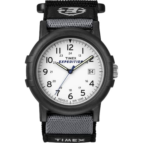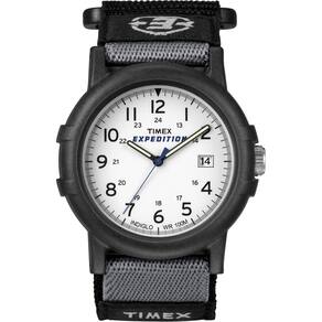 Timex Relógio masculino T49713 Expedition Camper preto com pulseira rápida, Envoltório rápido preto/branco, Resistente - Alça de nylon preta ajustável de 18 mm com fecho de gancho e aparência que se ajusta a pulsos de até 20 cm de circunferência - Mostrador branco com janela de data às 3 horas; números arábicos completos - Caixa de resina preta de 38 mm com lente acrílica - Mostrador do relógio Indiglo iluminado; ponteiros luminosos - Resistente à água até 100 metros: em geral, adequado para mergulho com snorkel e natação, mas não para mergulho