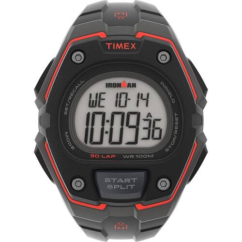 Timex Relógio masculino Ironman Classic 30 extragrande de 45 mm, Cinza escuro/preto/vermelho, Cronógrafo - Pulseira de resina preta ajustável de 20 mm para circunferência de pulso de até 20 cm - Cronógrafo de 100 horas com memória de 30 voltas; temporizador de contagem regressiva de 24 horas - 3 alarmes diários, dias da semana ou fim de semana; modo de horário militar 24 horas; 2 fusos horários; calendário de dia, data e mês - Caixa de resina cinza escuro e preto de 43 mm com lente acrílica; detalhes em vermelho; mostrador digital cinza; mostrador do relógio Indiglo que acende - Resistente à água até 100 m: em geral, adequado para natação e snorkeling, mas não para mergulho