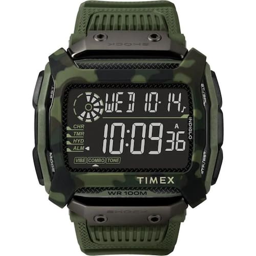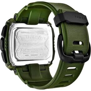 Funções: Digital, Iluminação Indiglo Night Light , 3 Fusos Horários, Calendário, Cronógrafo de 100 Horas, 3 Alarmes Com função vibratória e função soneca de 5 minutos , Timer de 24h, Sinal Horário Opcional Resistência à Água: 100m Diâmetro da Caixa: 54 mm x 45 mm Características: com caixa em Resina Verde e pulseira em Poliuretano Macia Verde Vidro: acrílico Fundo Parafusado Alimentação do maquinário: Bateria Mostrador Preto com detalhes em verde Linha: Timex Shock Resistant