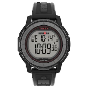 Funções: Digital, Iluminação Indiglo Night Light , Calendário, Dual Time, Cronógrafo com memória para 50 voltas, Alarme, Timer, Sinal Horário Opcional Resistência à Água: 100m Diâmetro da Caixa: 47 mm Características: com caixa em Resina Preta e pulseira em Poliuretano Preta Vidro: acrílico Fundo Parafusado Alimentação do maquinário: Bateria Mostrador Preto com detalhes em vermelho Linha: Timex Ironman