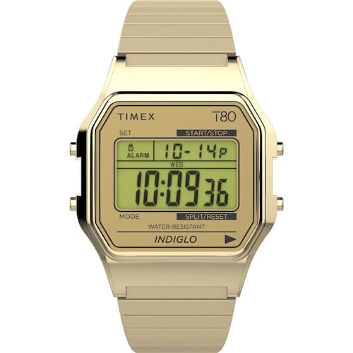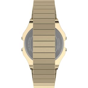 Timex Relógio T80 de 34 mm com pulseira de aço inoxidável, dourado/dourado/digital, Moderno - Caixa dourada de 34 mm - Pulseira de expansão dourada de 20 cm - mostrador digital - Lente acrílica - Resistente à água até 30 metros