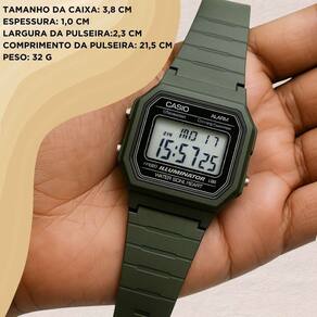 Ficha técnica: Marca: Tokaia Modelo: W-217H-3AV Movimento: Digital Material da Caixa: Resina Material da Pulseira: Resina Resistência à água: 5 ATM (50 metros) Formato: Retangular Gênero: Masculino Estilo: Casual / Outdoor Tamanho da caixa: 3,8 cm Espessura: 1,0 cm Largura da pulseira:2,3 cm Comprimento da pulseira: 21,5 cm Peso: 32 g