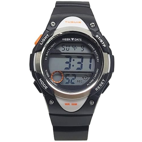 Relógio Tuguir Masculino Ref: 1077 Tg30348 Infantil Digital DESCRIÇÃO DO PRODUTO: Funções: Digital, Calendário, Iluminação, Alarme, Cronógrafo Resistência à Água: 50m Diâmetro da Caixa: 38 mm Características: com caixa em Policarbonato Preta e pulseira em Poliuretano Preto Vidro: Acrílico Fundo Parafusado Alimentação do maquinário: Bateria Mostrador Preto com detalhes em branco e vermelho de 1 Ano Marca: Não Informado