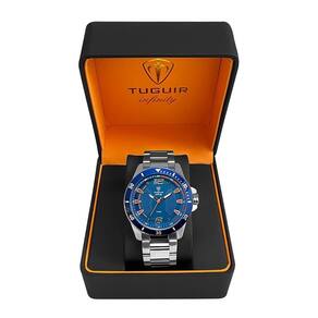 Funções: Analógico Resistência à Água: 50m Diâmetro da Caixa: 43 mm Características: com caixa em Aço e pulseira em Aço Vidro: Cristal Mineral Fundo Rosqueado Alimentação do maquinário: Bateria Mostrador Azul Com Números e Detalhes Em Vermelho Aro Azul Fixo Linha: Tuguir Infinity
