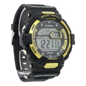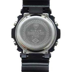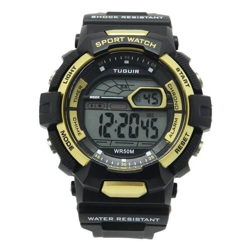 Características: com caixa em Policarbonato preto com detalhes em dourado e pulseira em Poliuretano Preto