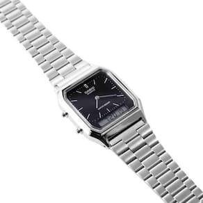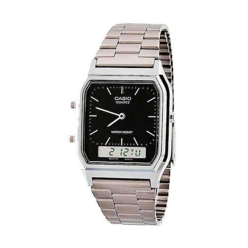 Recursos? Hora dual ? Cronômetro de 1/100 segundo ? Visor de data e hora na posição 6 horasEspecificaçõesMaterial do corpo/anel: Resina / CromadoFecho ajustávelPulseira de Aço InoxidávelVidro com resinaResistente a águastyle="margin: 0.667em 0px 0px;">