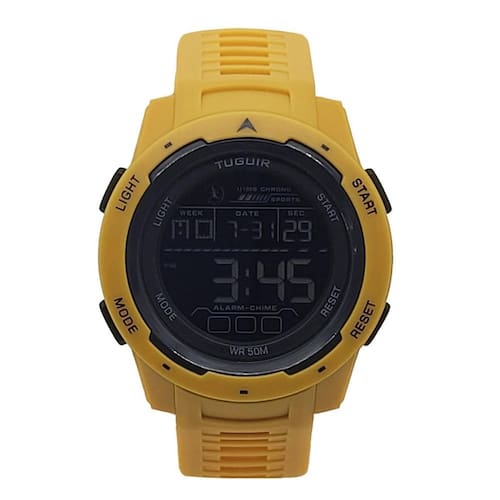 Relógio Unissex Relógio Tuguir Digital TG30398 Amarelo Relógio Unissex Relógio Tuguir Digital TG30398 Amarelo Marca: Tuguir Categoria: Digital Analógico: Não Digital: Sim 1 Horário Despertador: Sim Mostra o Dia da Semana: Sim Mostra o Dia do Mês: Sim Cronômetro: Sim Luz: Sim Cor da Iluminação: Azul Resistente à Água: 5 ATM Pode ser Utilizado para nadar no raso, por pouco tempo submerso - Respingos: Sim - Chuva: Sim - Lavar Carro: Sim - Lavar Louça: Sim - Natação: Sim - Mergulho: Não Característica do Vidro: Acrílico Tipo de Fecho: Fivela Cor da Caixa: Amarelo Material da Caixa: Plástico Formato da Caixa: Redondo Diâmetro da Caixa: 55,00 mm Espessura da Caixa: 16,00 mm Cor da Pulseira: Amarelo Material da Pulseira: Borracha Largura da Pulseira: 22,00 mm Comprimento Máximo da Pulseira: 250,00 mm Alimentação: Bateria Interna Peso Líquido: 0,049 Kg Modelo: TG30398 Cor Predominante: Amarelo : 12 Meses Conteúdo da Embalagem: 01 Relógio 01 Embalagem 01 Termo de Ean: 7891368316321