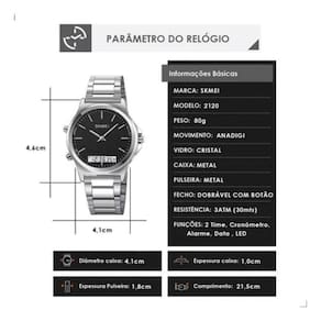 Marca: skmei Categoria: ana-digi Analógico: sim 1 horário Ponteiros fluorescentes: não Digital: sim 1 horário Calendário: sim Despertador: sim Mostra o dia da semana: sim Mostra o dia do mês: sim Cronômetro: sim Contador regressivo: não Luz: sim Cor da iluminação: verde Resistente à água: 3 atm resiste a imersões breves Respingos: sim Chuva: sim Lavar carro: sim Lavar louça: sim Natação: não Mergulho: não Característica do vidro: cristal mineral Tipo de fecho: dobrável com botão Cor da caixa: prata Material da caixa: metal banho ip Formato da caixa: redondo Diâmetro da caixa: 38,00 mm Espessura da caixa: 10,00 mm Cor da pulseira: prata Material da pulseira: metal Largura da pulseira: 18,00 mm Comprimento máximo da pulseira: 215,00 mm Alimentação: bateria interna Peso líquido: 0,080 kg Modelo: 2120 Cor predominante: prata : 12 meses O que vem na caixa: 01 relógio 01 embalagem 01 termo de Marca: Não Informado Ean: 7908289223369