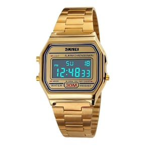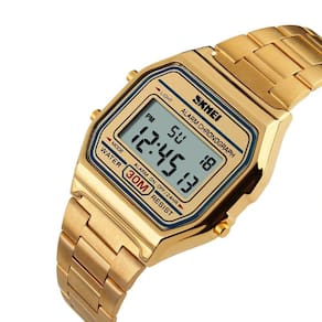Relógio Unissex Skmei Digital 1123 - Dourado Marca: Skmei Categoria: Digital Analógico: Não Digital: Sim (1 Horário) Calendário: Sim Despertador: Sim Mostra o Dia da Semana: Sim Mostra o Dia do Mês: Sim Cronômetro: Sim Contador Regressivo: Não Luz: Sim Cor da Iluminação: Verde Resistente à Água: 3 ATM (Resiste a imersões breves) - Respingos: Sim - Chuva: Sim - Lavar Carro: Sim - Lavar Louça: Sim - Natação: Não - Mergulho: Não Característica do Vidro: Cristal Mineral Tipo de Fecho: Dobrável Cor da Caixa: Dourado Material da Caixa: Metal Banho IP Formato da Caixa: Quadrado Comprimento da Caixa: 33,90 (mm) Largura da Caixa: 33,90 (mm) Espessura da Caixa: 9,50 (mm) Cor da Pulseira: Dourado Material da Pulseira: Aço Largura da Pulseira: 14,60 (mm) Comprimento Máximo da Pulseira: 210,00 (mm) Alimentação: Bateria Interna Peso Líquido: 0,057 Kg Modelo: 1123 Cor Predominante: Dourado Garantia: 12 Meses