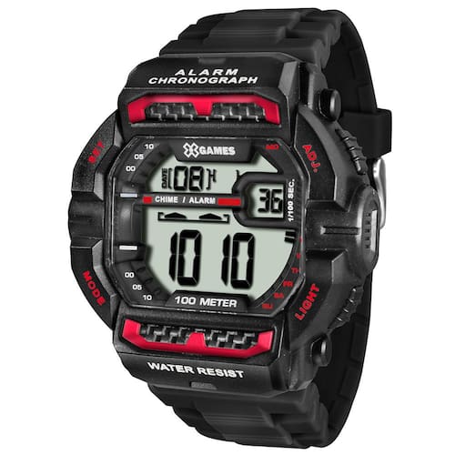 - Marca: X-Games - Referência: XGPPD086-BXPX - Gênero: Masculino - : 1 Ano em Toda Rede de Assistência Técnica X-Games no Brasil Características - Composição do Vidro: Acrílico - Material da Caixa: Policarbonato - Cor da Caixa: Preto/Vermelho - Material da Pulseira: Poliuretano - Cor da Pulseira: Preto - Tampa Posterior: Parafusado Medidas - Diâmetro da Caixa: 5,0cm Resistência a Água - WR: 100 Mts - Pode Lavar as Mãos: SIM - Pode Usar em Água Corrente: SIM - Pode Usar na Piscina: SIM - Pode Usar em Mergulho Profundo: NÃO Funções Especiais - Calendário Digital - Cronômetro Digital - Alarme - Timer - Dual Time Marca: Não Informado