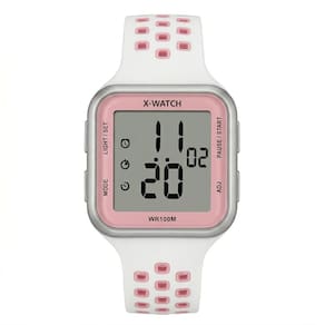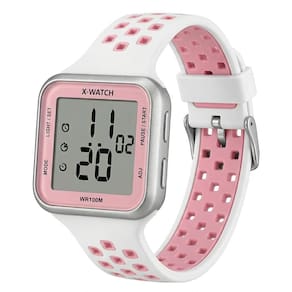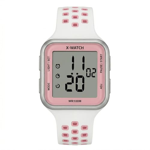 Características: com caixa em Resina Prateada e pulseira em Silicone branco com detalhes em rosa