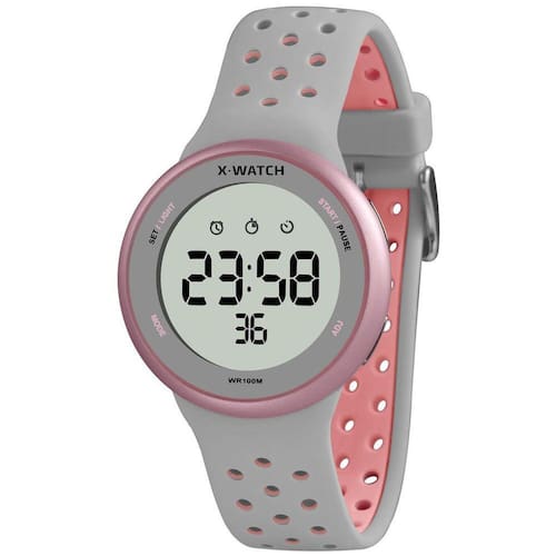 Relógio X-Watch Feminino Ref: Xfppd039w Bxgr Esportivo Digital DESCRIÇÃO DO PRODUTO: Funções: Digital, Iluminação, Calendário, Cronógrafo, Alarme, Timer Resistência à Água: 100m Diâmetro da Caixa: 43 mm Características: com caixa em Resina Rosa com detalhes prateados e pulseira em Silicone Cinza com detalhes rosa Vidro: acrílico Fundo Parafusado Alimentação do maquinário: Bateria Mostrador Cinza com detalhes em rosa e preto Garantia de 1 Ano Marca: X-Watch