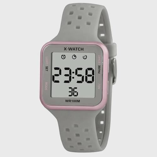 Descrição do produto:Funções: Digital, Iluminação, Calendário, Cronógrafo, Alarme, TimerResistência à Água: 100mDiâmetro da Caixa: 38 mm x 38 mmCaracterísticas: com caixa em Resina Rosa com detalhes prateados e pulseira em Silicone CinzaVidro: AcrílicoFundo ParafusadoAlimentação do maquinário: BateriaMostrador Cinza com detalhes em rosa e pretoGarantia de 1 Ano Marca: X-Watch
