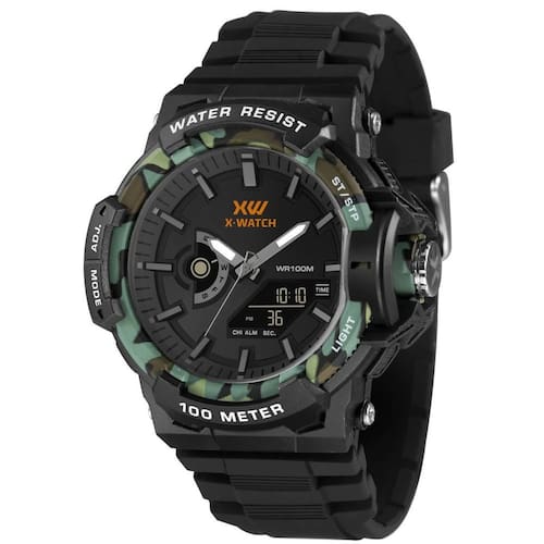 Relógio X-Watch Masculino Ref: Xmppa346 P1px Esportivo Anadigi DESCRIÇÃO DO PRODUTO: Funções: Anadigi, Iluminação, Calendário, Cronógrafo, Alarme, Timer, Dual Time Resistência à Água: 100m Diâmetro da Caixa: 51 mm Características: com caixa em Resina Preta e pulseira em Silicone Preta Vidro: acrílico Fundo Parafusado Alimentação do maquinário: Bateria Mostrador Preto com detalhes em laranja Aro estilo camuflado verde de 1 Ano Marca: Não Informado