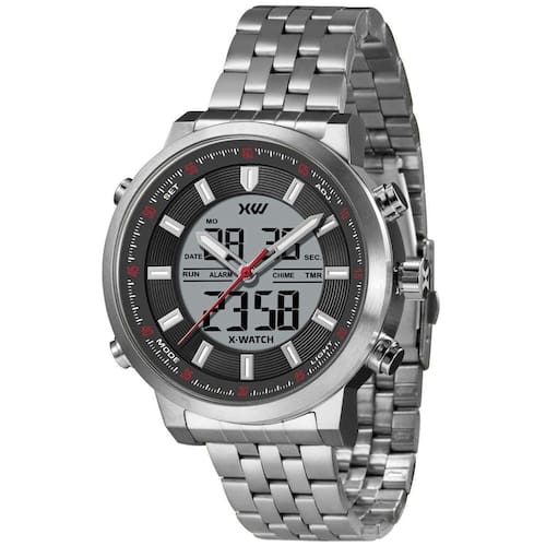 Visor: LCD Funções: Anadigi, Calendário, Iluminação, Alarme, Cronógrafo, Dual Time, Timer Resistência à Água: 100m Diâmetro da Caixa: 48 mm Características: com caixa em Aço e pulseira em Aço Vidro: Cristal Mineral Fundo Rosqueado Alimentação do maquinário: Bateria Mostrador Preto