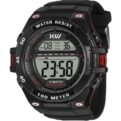 Marca: X-Watch Gênero: Masculino Linha: XTYLE Diâmetro da Caixa: 52mm Prova d'água 100M Caixa: em policarbonato Pulseira: em silicone Vidro: em acrílico Funções: Digital, Cronógrafo, Alarmes, Timer, Dual Time, Calendário, 12/24 h, Iluminação