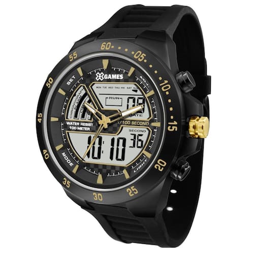 Vidro: Cristal Diâmetro da caixa: 48mm Cor da caixa: Dourado/Preto Cor da pulseira: Preto Material da caixa: Aço Material da pulseira: Silicone Water Resistant: 10atm / 100m Visor: CINZA