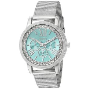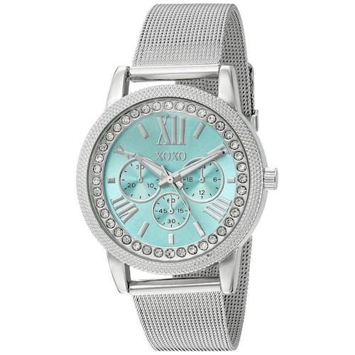 Relógio prateado com moldura texturizada e mostrador azul emoldurado em círculos cintilantes