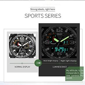 1. Marca: SMAEL 2. Mostra de hora dupla com função de luz de fundo LED 3. 50M resistente à água 4. Tipo: Relógios esportivos masculinos 5. Movimento: Movimento digital do Japão 6. Existem 13 cores para a seleção 8. Largura da pulseira: (aprox.) 2,1 cm 9. Diâmetro do mostrador: (aprox.) 5,1 cm 10. Material da pulseira: PU forte 11. Material da caixa: borracha forte+vidro endurecido de alta resistência 12. Fecho: Fivela 13. Mostrando o tempo preciso 14. É um bom presente para alguém especial. Nota: sugerimos que você não o use ao nadar. Mas se você for nadar ou mergulhar, por favor, não pressione nenhum botão debaixo d'água! Componentes incluídos: -1 x relógio SMAEL genuíno -1 x manual de uso -1 x caixa de presente