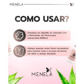 Como remover henna da sobrancelha com nosso removedor 1º Umedeça o algodão ou cotonete com o Removedor de Henna para sobrancelha MENELA. 2º Aplique quantas vezes forem necessárias para remover todo o excesso da henna na sobrancelha até obter o melhor design ou a remoção desejada.