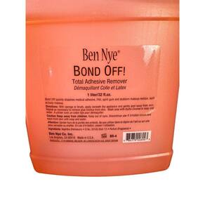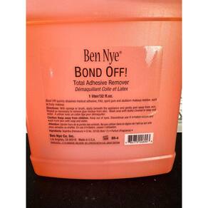 Ben Nye Bond Off é feito para remover a maioria dos adesivos cosméticos ou adesivos similares da pele completamente. Extremamente eficaz e cheira muito bem. Adequado para remover goma de mascar, mastix, adesivo protético, cola cosmética e muitos outros adesivos. Para usar, aplique Bond Off com uma esponja ou pincel para as bordas da prótese ou cabelo crepe ou aparelho ; em seguida, retire suavemente para remover. Repita conforme necessário; escovando Bond Off mais sob a borda descascada do aparelho, se necessário. Aplique mais Bond Off para remover completamente todos os resíduos. Em seguida, siga com uma lavagem suave com água e sabão ou Hydra Cleanse.