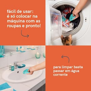 Além de pelos, ele também remove fiapos e cabelos das peças. Bem fácil de usar, é só colocá-lo na máquina de lavar junto com as roupas, sendo necessário apenas 1 removedor para cada pet na casa. Ele é reutilizável e não danifica os tecidos. Para maior duração, evite usar amaciante junto com seu tira pelos, tá bem?