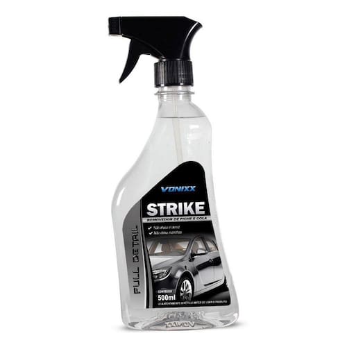 Strike Removedor de Piche e Cola 500ml Vonixx Detalhes do Strike Vonixx: O Strike Removedor de Piche e Cola da Vonixx é um agente solubilizante, desenvolvido para remoção de piche e resíduos de colas deixados por adesivos e etiquetas autocolantes em geral. Sua composição balanceada remove grande parte de colas impregnadas e piche.