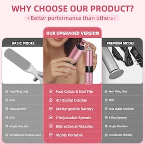 - Tela digital clara e função de memória: mantenha-se informado com uma tela HD brilhante que mostra as configurações de velocidade em tempo real e a duração da bateria. O recurso de memória automática deste removedor elétrico de calos nos pés economiza a velocidade usada pela última vez, eliminando ajustes repetitivos e economizando seu tempo.