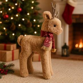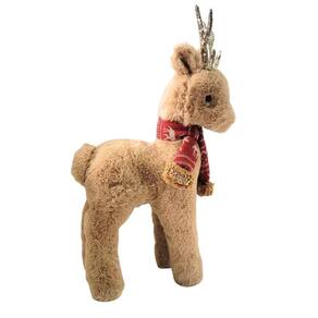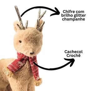 Rena Decorativa de Natal em Pelúcia Marrom com Cachecol Vermelho e Chifres Glitter 40cm