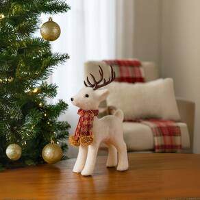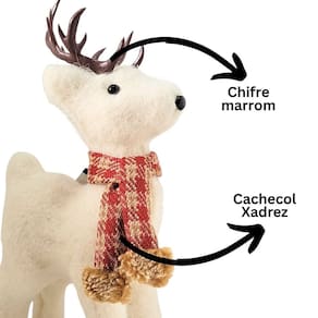 Complete sua decoração de Natal com a Rena Decorativa em Pelúcia Creme, modelo em pé com cachecol xadrez vermelho e marrom. Um enfeite elegante e acolhedor que traz o espírito natalino para qualquer ambiente.