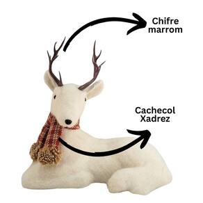 Adicione aconchego e charme à sua decoração natalina com a Rena Decorativa em Pelúcia Creme, modelo deitada com cachecol xadrez vermelho e marrom. Seu design delicado e realista transforma qualquer ambiente, sendo perfeita para enfeitar mesas, aparadores, prateleiras ou compor cenários de Natal com elegância.