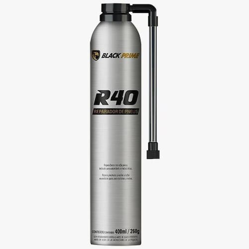 R40 - reparador de pneus black prime Sobre o produto Repara furos e infla o pneu imediatamente, sem necessidade de removê-los. Veda e enche instantaneamente; Repara e reinfla automaticamente sem necessidade de removê-lo ou de utilização de ferramentas. Instruções Para todos os pneus com câmara, de carros de passeio e motos. Este produto não é indicado nos seguintes casos: rasgos ou furos laterais, se a válvula do pneu estiver dentro da roda e pneus sem câmara, quando a tala não estiver encostada no aro. Modo de usar