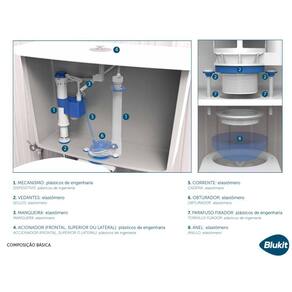 O Kit Completo para Caixa Acoplada é instalado dentro da caixa acoplada e é composto pelo Mecanismo de Entrada, que tem a finalidade de controlar o fluxo de entrada de água para dentro da caixa acoplada; o Mecanismo de Saída que tem a finalidade de controlar o fluxo de água para dentro do vaso sanitário; o Kit Completo para Vedação e Fixação que tem a finalidade de vedar e fixar a caixa acoplada no vaso sanitário e o Acionador que tem a finalidade de acionar todo o sistema. O Kit Completo para Caixa Acoplada é aprovado nos testes de qualidade que asseguram sua vedação, funcionamento e resistência. Adquirir produtos Blukit é certeza de adquirir um produto de qualidade.