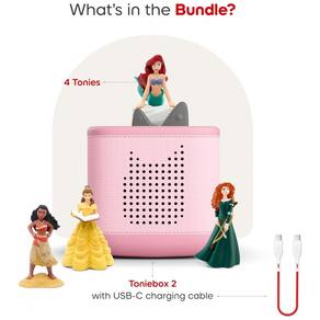 Conteúdo da caixa: Reprodutor Toniebox 2, Figuras das Personagens(Ariel, Moana, Merida, Belle), cabo USB-C de 22 cm