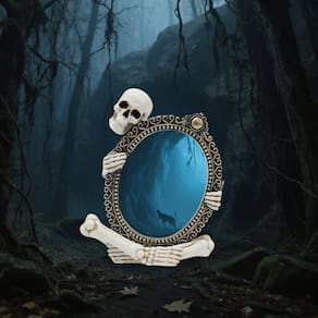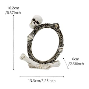 Material: Resina Tamanho: 13,3 cm × 6 cm × 16,2 cm Peso: 263 g ['• Design gótico da moldura de caveira: esta escultura de esqueleto misteriosa apresenta um crânio detalhado segurando uma moldura oval ornamentada, perfeita para adicionar um toque assustador à decoração do jardim de Halloween e aos ambientes internos. ', '• Detalhes ósseos realistas: com mãos e ossos esqueléticos esculpidos em volta da moldura, os ornamentos das figuras proporcionam um impacto visual arrepiante para exibições com temas góticos e de terror. ', '• Artesanato durável em resina: feita de resina de alta qualidade, a estátua é robusta e resistente às intempéries, ideal para decoração de pátio, plantador, prateleira ou quintal mal-assombrado sem desbotar. ', '• Toque decorativo versátil: adequado para mesas, entradas, displays de parede ou configurações de altar temáticas, aprimorando ambientes assustadores com ornamentação em estilo antigo. ', '• Perfeito para cenas sazonais: uma figura de destaque para festas de Halloween, exposições de terror ou arranjos de jardins em estilo cemitério, combinando perfeitamente com caveiras e estátuas escuras.']