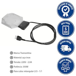 5.Qual é a potência e a voltagem da resistência elétrica Tramontina? A resistência elétrica Tramontina possui potência de 350W e é compatível com voltagem de 220V. Capacidade de Volume: 0 | Quantidade: 1 | COR: Preto | Quantidade de cubas: 1 | Capacidade da cuba: 1 | Material do rechaud: Aço inox | Quantidade de aquecedores: 1 | Forma do rechaud: Redonda | Certificações: Inmetro 148/2022 | Tamanho: 0 | Itens inclusos: Resistência | Código certificação: 148/2022 OCP 0029 | Voltagem: 220 V | Fabricante: Tramontina | Material: Aço Inox | Duração da Garantia: 3 meses | Diâmetro: 0 | Sabor: Não aplica | Certificado de Homologação da Anatel: Não aplica | ISBN: Não aplica | Garantia: 3 meses | CAPACIDADE: 350 W | EmbalagemComprimento-cm: 26 | Modelo: Para Rechaud Cuba Retangular 220V 350w | EmbalagemAltura-cm: 11 | Cubagem: 0.008294 | Peso Líquido: 0.0000 | Marca: Tramontina | EmbalagemLargura-cm: 29 | Dias Entrega Fornecedor: 0 Ean: 7891116047651
