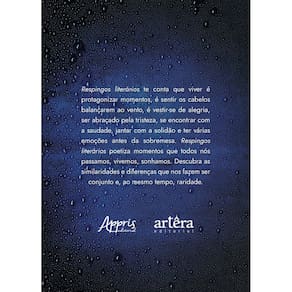 Respingos literários te conta que viver é protagonizar momentos, é sentir os cabelos balançarem ao vento, é vestir-se de alegria, ser abraçado pela tristeza, se encontrar com a saudade, jantar com a solidão e ter várias emoções antes da sobremesa. Respingos literários poetiza momentos que todos nós passamos, vivemos, sonhamos. Descubra as similaridades e diferenças que nos fazem ser conjunto e, ao mesmo tempo, raridade.