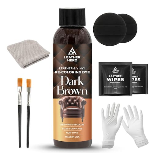 Transforme seus itens desgastados de couro e vinil com o kit completo Leather Hero Black Color Restorer de 118 ml. Este kit de reparo de couro tudo-em-um para móveis, interiores de carros e muito mais inclui tudo o que você precisa para trazer vida de volta às suas peças favoritas: uma garrafa de 118 ml de restaurador de cor preta, 2 aplicadores de esponja, 2 pincéis pequenos de detalhes para áreas difíceis de alcançar, 2 lenços de limpeza para uma rápida pré-limpeza, luvas e um pano premium de 30,5 cm x 30,5 cm para um acabamento suave. Se você deseja renovar a cor de até 10 pares de sapatos, botas, jaquetas ou itens maiores, como um pufe, assento de amor ou até mesmo um sofá completo, este kit tem o que você precisa. Nosso restaurador efetivamente muda, atualiza, revive, ilumina e restaura a cor, cobrindo sem esforço arranhões, arranhões de gatos, desbotamento, desgaste e desgaste da cabeça. Funciona como um bálsamo de recoloração de couro, tinta de couro e tinta de couro para móveis, fornecendo uma solução versátil para todas as suas necessidades de restauração. Orgulhosamente feita nos EUA com mais de 100.000 garrafas vendidas, nossa fórmula não tóxica é segura para animais de estimação e crianças e não desbota nas roupas, garantindo um acabamento flexível e durável. Ao contrário dos produtos concorrentes feitos na China, nosso kit de reparo de couro garante qualidade e confiabilidade superiores. Adequado para uso em todas as superfícies de couro, couro sintético e vinil, este kit oferece uma solução versátil para reparo de couro para sofás, reparo de assento de carro e muito mais. Restaure e proteja seus itens valiosos com o kit completo Leather Hero Black Color Restorer de 118 ml e experimente a diferença de qualidade premium, feita nos EUA. Perfeito para reparo de arranhões de couro, restaurador de cor de sofá de couro e tinta de estofamento de vinil, este kit é a solução ideal para todas as necessidades de reparo de couro e vinil. - Kit completo de reparo de couro: Este kit de reparo de couro completo inclui uma garrafa de Leather Hero Color Restorer, 2 aplicadores de esponja, 2 pincéis pequenos de detalhes, 2 lenços de limpeza, luvas e um pano premium de 30,5 x 30,5 cm. Tudo o que você precisa para restauração completa do couro e acabamento em um pacote conveniente. - RESULTADOS PROFISSIONAIS, FÁCIL DIY: Obtenha resultados de nível profissional com este kit DIY fácil de usar. Perfeito para proprietários e entusiastas, oferece uma solução simples e eficaz para cuidados e restauração do couro. - RESTAURAÇÃO VERSÁTIL DE COURO: Ideal para restaurar móveis de couro, interiores de carros, sapatos, botas, jaquetas e muito mais. A fórmula universal cobre arranhões, desbotamento, desgaste e outros danos. Uma garrafa pode restaurar um sofá inteiro ou até 10 pares de sapatos ou bolsas. - RESTAURADOR DE CORES EFETIVO: Renove e revitalize o couro com nosso Color Restorer. Cobre efetivamente arranhões, desgaste e desbotamento, mantendo a textura autêntico. A fórmula não racha ou descasca, garantindo um acabamento suave e sem costura. - Fórmula segura e confiável: Orgulhosamente feita nos EUA com mais de 100.000 garrafas vendidas. Nossa fórmula não tóxica é segura para uso perto de animais de estimação e crianças e não é transferida para roupas. Este é o mesmo restaurador de cores Leather Hero confiável em um pacote atualizado. - Funciona em todo o couro e vinil: adequado para todos os tipos de couro, couro sintético e superfícies de vinil. Restaura a beleza autêntico e a flexibilidade de seus itens. Ideal como tinta de couro, tinta de couro ou kit de reparo de vinil. (Não é adequado para camurça).