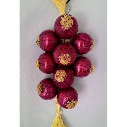 Restia ou Trança de Cebola Artificial para Decoração, produzida artesanalmente com técnicas de moldagem com ráfia de sopro sobre uma bola de isopor, pintado com verniz vitral e acabada com verniz acrilico. A cebola tem raízes de musgo seco e é amarrada a uma trança de corda de sisal. A peça é leve e pode ser pendurada até em ganchos adesivos, protegida do calor intenso, chuva e sol. Indicada especialmente para decoração de ambientes gourmets, como áreas de churrasqueiras, cozinhas, na decoração de restaurantes e pizzarias, em pousadas e chalés, casas de sítios e também urbanas, salão de festa e cenários. Produto versátil, com aspecto rústico e que fica muito bem em ambientes onde se deseja um toque de nostalgia, combinando perfeitamente em espaços gourmet.