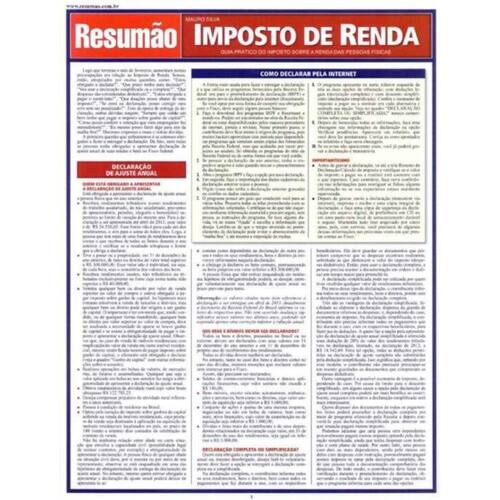Este Resumão contém - A declaração de ajuste anual - quem está obrigado a declarar, declaração completa ou simplificada, forma de apresentação da declaração, prazos, a situação do casal, declaração retificadora, declaração de isento. Ganho de capital. Cálculo do Imposto e do carnê-Leão. Tabelas para cálculo. Rendimentos tributáveis, rendimentos de aluguéis, rendimentos recebidos do exterior, rendimentos isentos ou não tributáveis. Residência no Brasil ou no exterior. Deduções permitidas. Doações dedutíveis. Como declarar pela internet. Malha fina, movimentação bancária, imóveis, carros e outros bens.