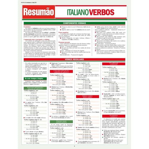 O Resumão Italiano Verbos Traz As Principais Dicas Para Que O Leitor Aprenda A Usar Corretamente Os Verbos Na Língua Italiana Nele Você Vai Encontrar Os Sete Tempos Simples E Compostos Dos Verbos Regulares Os Verbos Irregulares E Super Irregulares Os Quatro Padrões Verbais Irregulares As Construções Essenciais E Os Verbos Comuns Essenciais Rápido Para Aprender Fácil De Consultar O Resumão É Um Excelente Guia Para Quem Estuda Ou Tem Vontade De Estudar Italiano