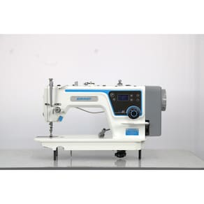 Maquina de costura reta 1 agulha, direct-drive, ponto fixo com posicionador de agulha, painel e controlbox embutidos no cabeçote, com sistema de meia pontada, alavanca manual para retrocesso, lançadeira rotativa padrão, controle da luminosidade da luz de led com 3 estágios, elevação do calcador de ate 13mm, velocidade 5000rpm, comprimento do ponto de ate 5mm, com tampo de mesa, estante com rodinhas, versão 220V,