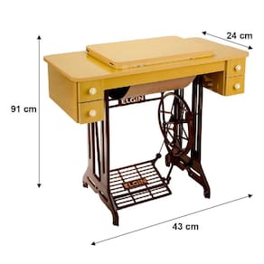 Máquina de costura reta doméstica com corpo em ferro fundido e eixo de transmissão em aço. Realiza costura reta com regulagem de comprimento e costura para trás. Possui enchedor de bobina. Inclui móvel tradicional com 2 gavetas e pés de ferro.Alça retrátil