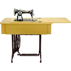 Máquina de costura reta doméstica com corpo em ferro fundido e eixo de transmissão em aço. Realiza costura reta com regulagem de comprimento e costura para trás. Inclui enchedor de bobina. O móvel é tradicional com 2 gavetas e pés de ferro.Funções