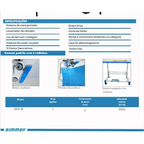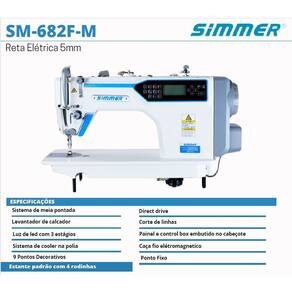SM-682F-M Maquina de costura reta 1 agulha eletrônica Direct Drive com, levantador de calcador controlado por motor de passo, corte de linhas, posicionador de agulha, caça fio eletromagnético, botão de reset no painel, sistema inteligente de transporte e calcador para costurar tecidos leves, sistema de cooler na polia para resfriamento, lançadeira padrão, painel e control box embutido no cabeçote, com sistema de meia pontada, ponto condensado controle de luminosidade da luz de LED com 3 estágios, de 5.000RPM, tamanho do ponto de 5MM, com estante equipada com rodinha. Versão 220 volts.