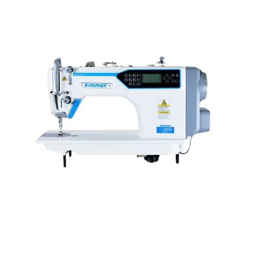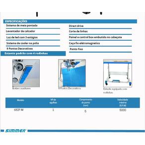 SM-682F-M Maquina de costura reta 1 agulha eletrônica Direct Drive com, levantador de calcador controlado por motor de passo, corte de linhas, posicionador de agulha, caça fio eletromagnético, botão de reset no painel, sistema inteligente de transporte e calcador para costurar tecidos leves, sistema de cooler na polia para resfriamento, lançadeira padrão, painel e control box embutido no cabeçote, com sistema de meia pontada, ponto condensado controle de luminosidade da luz de LED com 3 estágios, de 5.000RPM, tamanho do ponto de 5MM, com estante equipada com rodinha. Versão 220 volts.